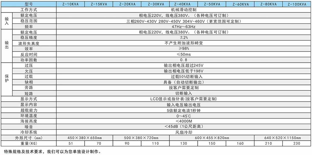 TNS(SVC)高性能全自动交流稳压电源,由接触式自耦调压器、伺服电动机、自动控制电路等部件组成,是采用伺服电机驱动碳刷改变调压器线圈匝数比来完成稳压功能的一种普及型交流稳压电源。当电网电压不稳定或负载功率变化时,自动控制电路按输出电压的变化驱动伺服电机,调整接触式自耦调压器上的碳刷的位置,使输出电压调整到额定值,实现自动稳压。本系列电源具有稳压范围宽、精度高、输出波形不失真、效率高等优点,能适应各种负载。